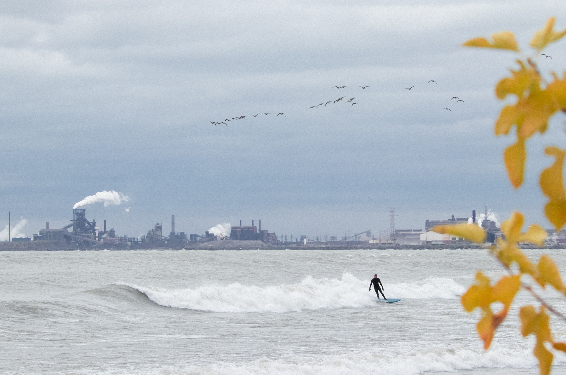 In an embrace of The Region's grit, surfers have learned to use some of the landscape to their advantage. The sand bars which form next to industry-made jetties and piers produce a long tapered wave that is rare on the Great Lakes. These manmade structures have also proven useful as a way to jump in and dodge wave sets before they close out, eliminating the need to paddle through whitewater. This is why spots like Miller Woods Beach, hugged by mills to the west, are well-liked in the community.